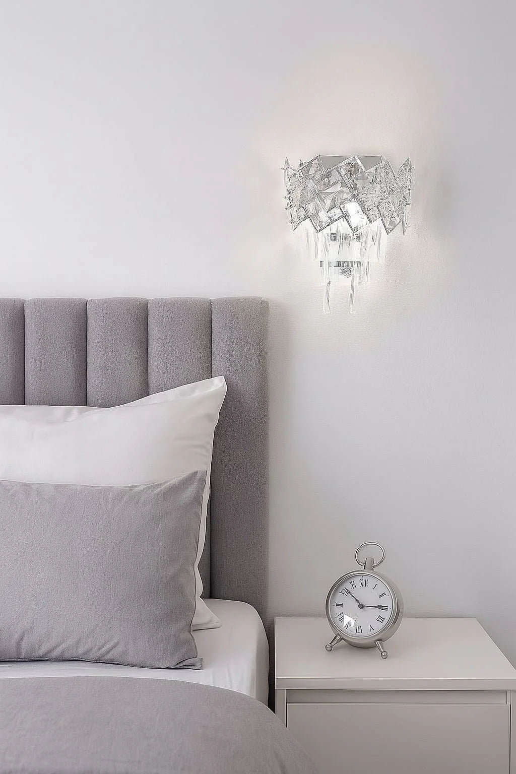 Aplica Stella cu latimea de 27 cm, inaltimea 15, iar lungimea de 29 cm, confectionata din metal argintiu si cristal, cu 2 surse de iluminat.