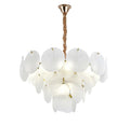Candelabru Geo, 10 surse de iluminat, metal auriu și alb cu sticla mata, diametru 60 cm, înălțime 36 cm.