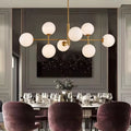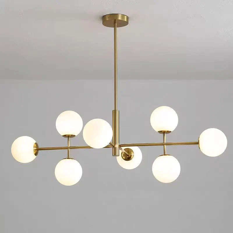 Lustra Edith cu lungimea de 100 cm, latimea de 70 cm, iar inaltimea reglabila de la 50 cm la 80 cm, confectionata din sticla si metal, cu 8 surse de iluminat tip bec E27.