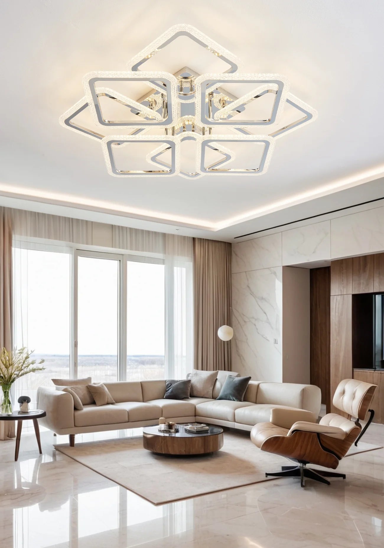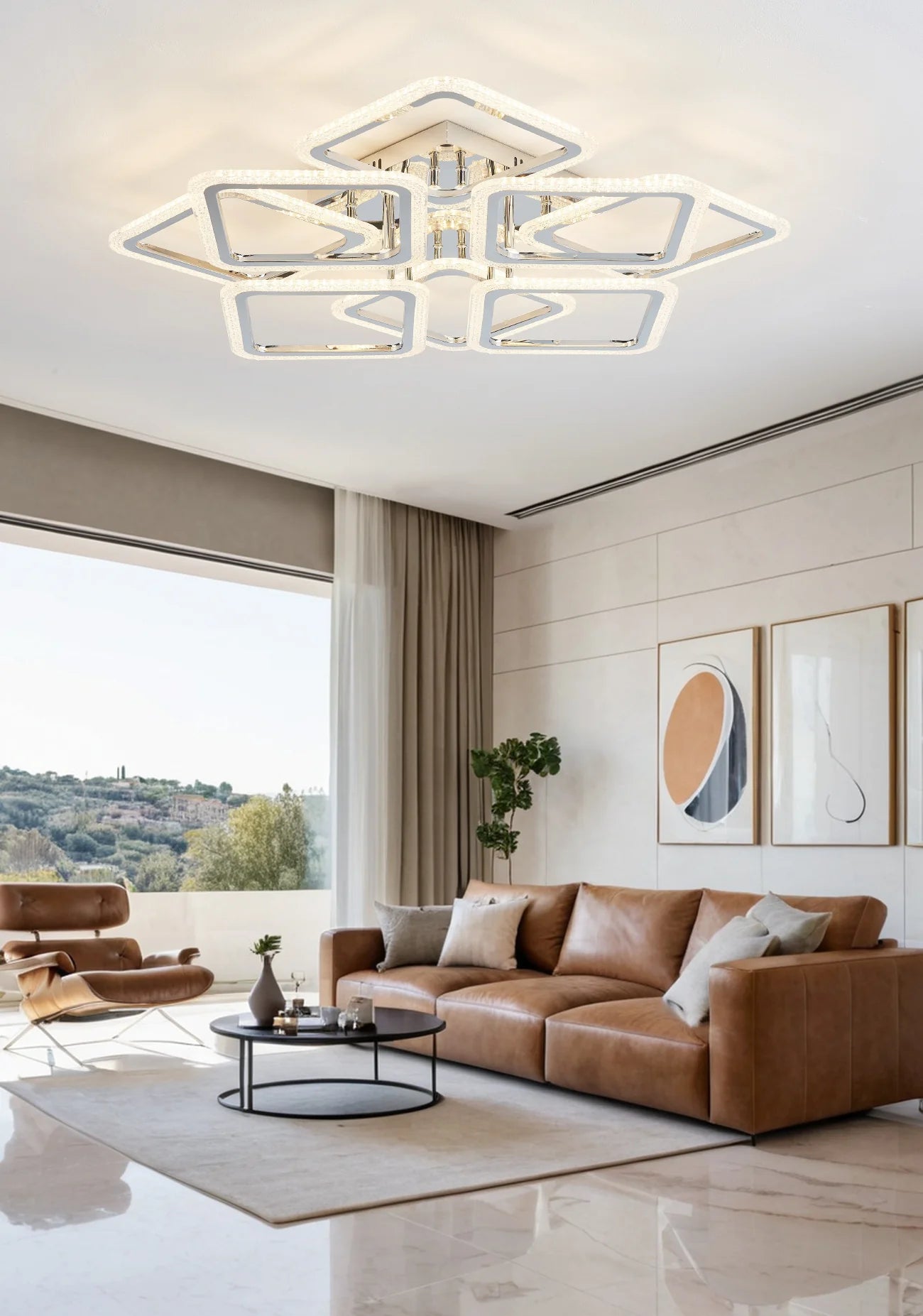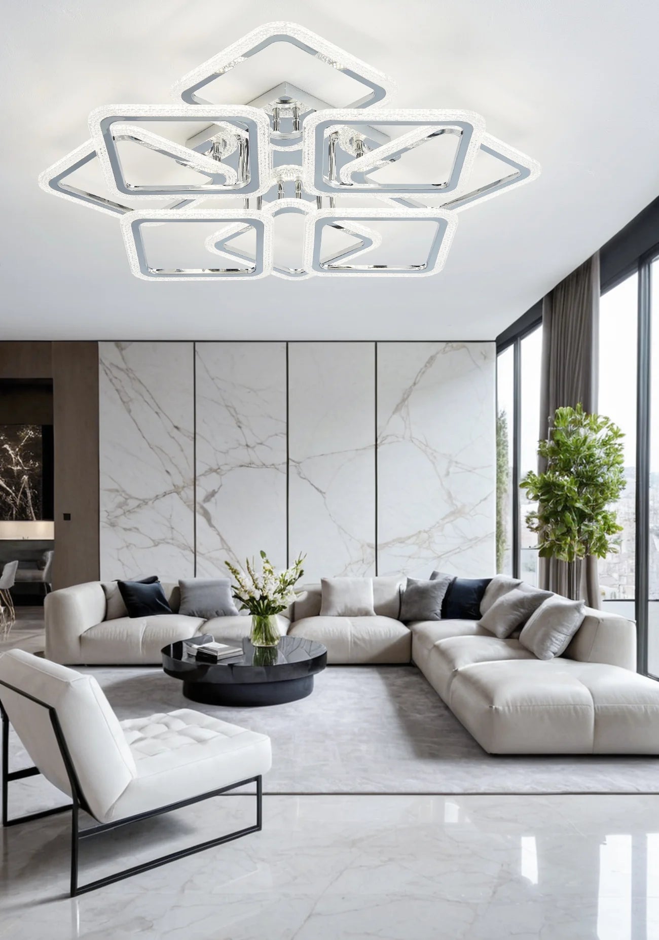 Lustra LED Adele cu latimea de 75 cm, inaltimea de 15 cm, iar lungimea de 75 cm confectionata din metal argintiu, cu 3 surse de iluminat tip banda LED, cu o putere de 240 W si 3 tipuri de lumina.