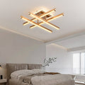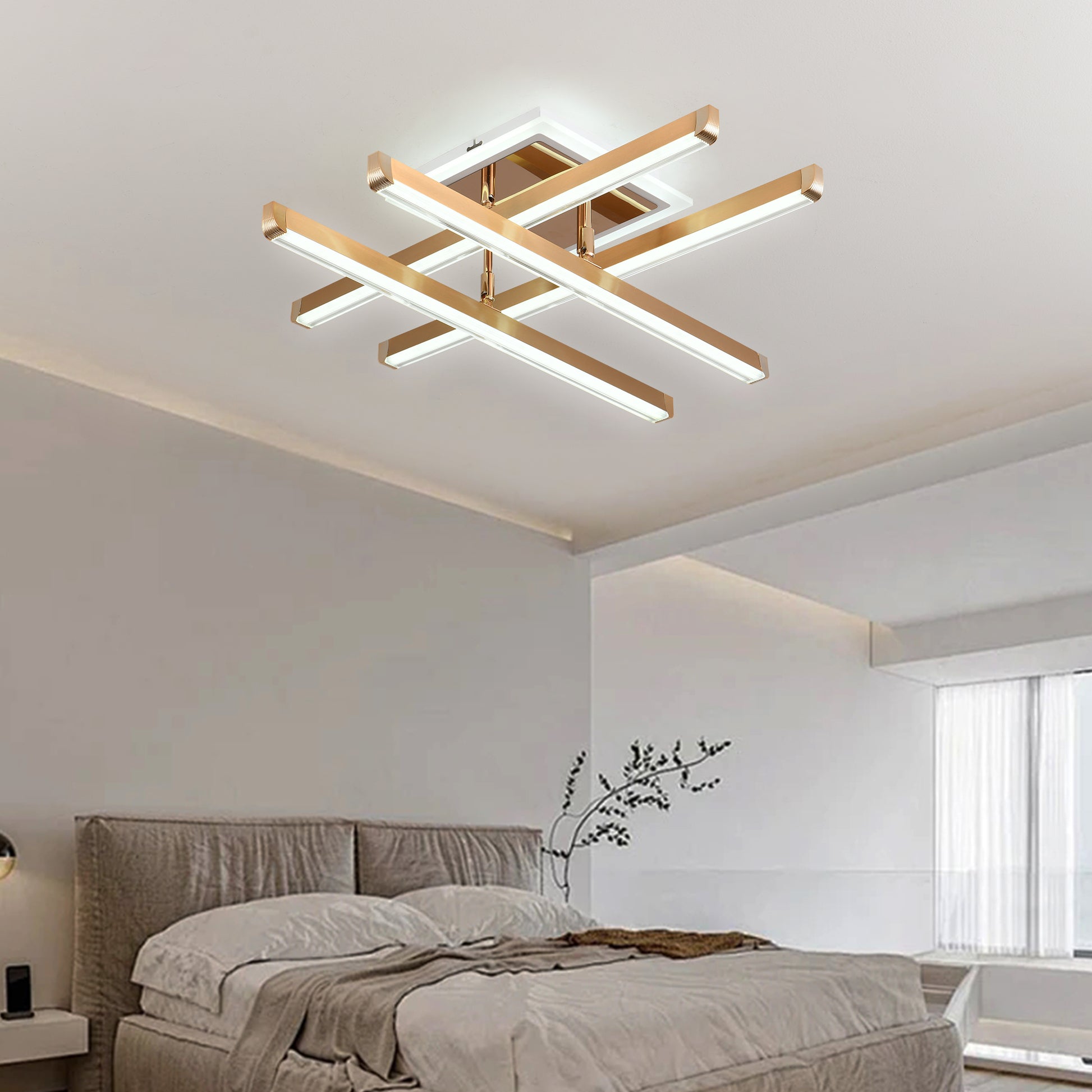 Lustra LED Agnes cu latimea de 60 cm, inaltimea de 18 cm, iar lungimea de 60 cm confectionata din metal si acril auriu, cu 3 surse de iluminat tip banda LED, cu o putere de 134 W si 4 tipuri de lumina.
