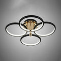 Lustra LED Agota cu latimea de 56 cm, inaltimea de 15 cm, iar lungimea de 56 cm confectionata din metal auriu si negru, cu 4 surse de iluminat tip banda LED, cu o putere de 104 W si 3 tipuri de lumina.