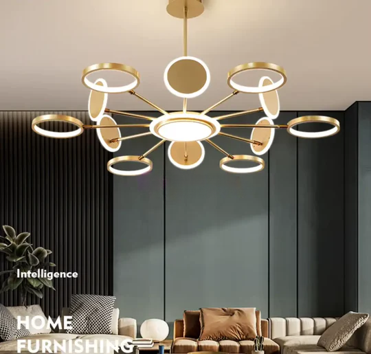 Lustra LED Alla cu latimea de 120 cm, inaltimea de 35 cm, iar lungimea de 120 cm confectionata din metal auriu si acril, cu 13 surse de iluminat tip banda LED, cu o putere de 143 W si 3 tipuri de lumina.