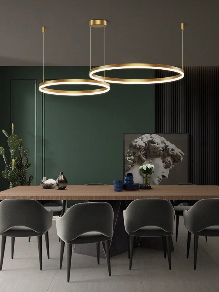Lustra LED Cataleya cu diametrul cercului mic de 40 cm, diametrul cercului mare de 60 cm, iar inaltimea reglabila de la 30 cm la 90 cm, confectionata din metal si acril auriu, cu 2 surse de iluminat tip banda LED, cu o putere de 120 W si 4 tipuri de lumina.