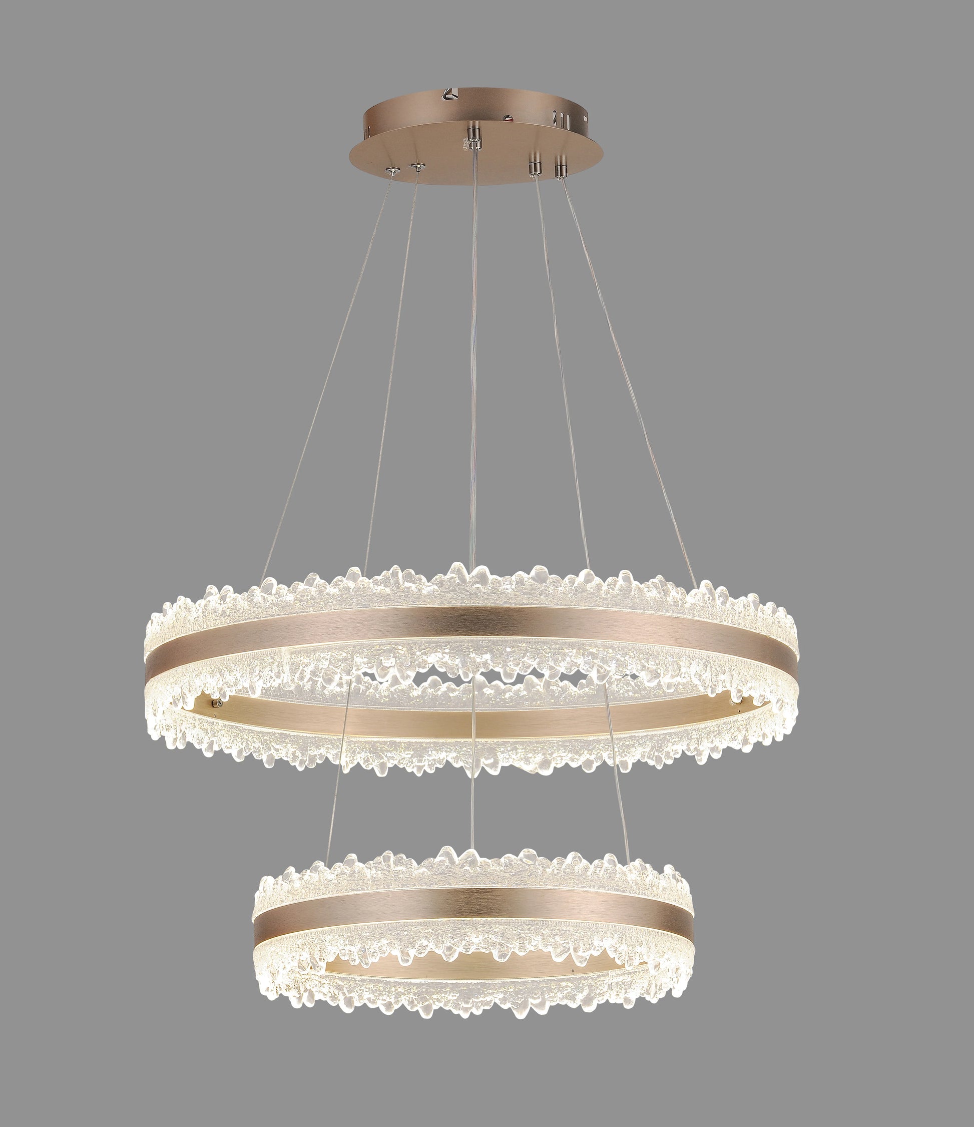 Lustra LED Cate cu diametrul cercului mare de 60 cm, iar diametrul cercului mic de 40 cm, inaltimea reglabila de la 40 cm pana la 120 cm, confectionata din metal si acril, cu 4 surse de iluminat tip banda LED, cu o putere de 288 W si 3 tipuri de lumina.