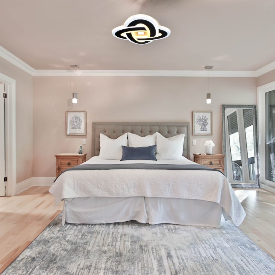 Lustra LED Cher cu latimea de 20 cm, inaltimea de 8 cm, iar lungimea de 20 cm confectionata din acril alb si negru, cu 4 surse de iluminat tip banda LED, cu o putere de 60 W si 3 tipuri de lumina.