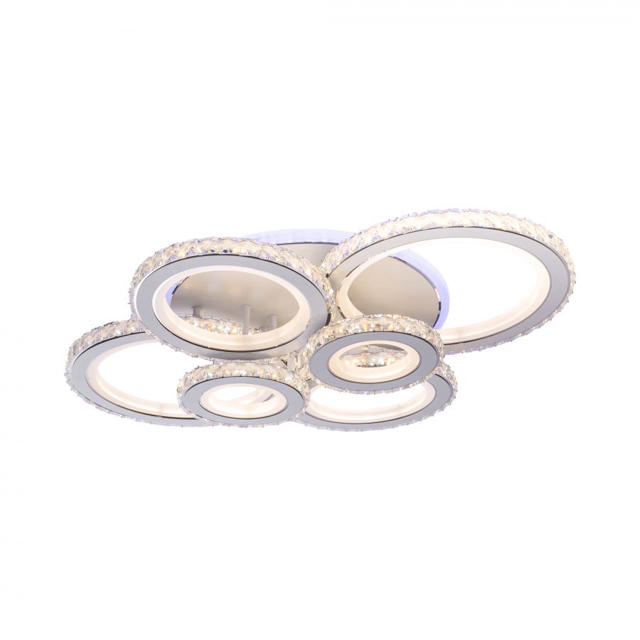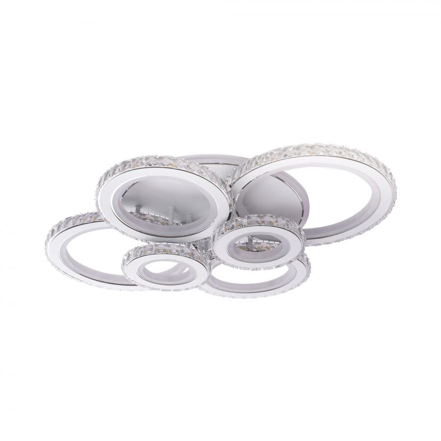 Lustra LED Cristina cu diametrul de 95 cm, confectionata din acril alb, cristal si metal, cu 7 surse de iluminat tip banda LED, cu o putere de 280 W si 3 tipuri de lumina.