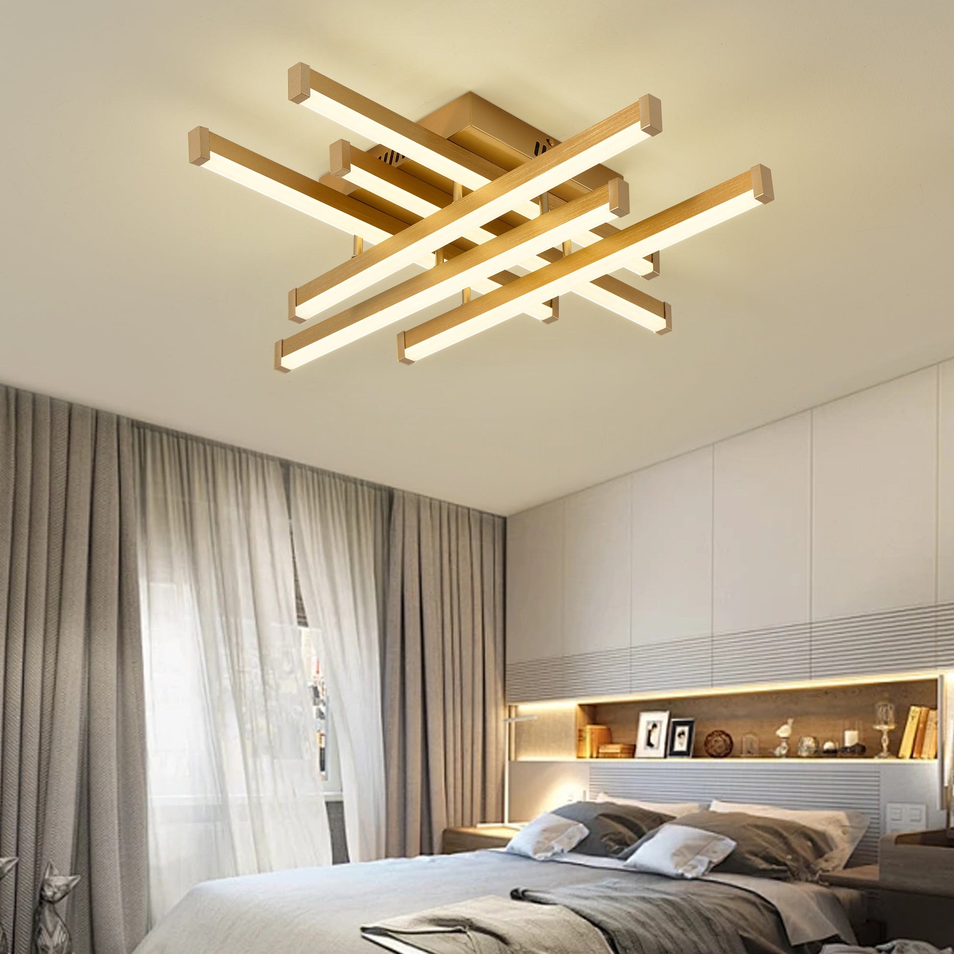 Lustra LED Eiko cu latimea de 65 cm, inaltimea de 13 cm, iar lungimea de 65 cm confectionata din metal si acril auriu, cu 6 surse de iluminat tip banda LED, cu o putere de 160 W si 4 tipuri de lumina.