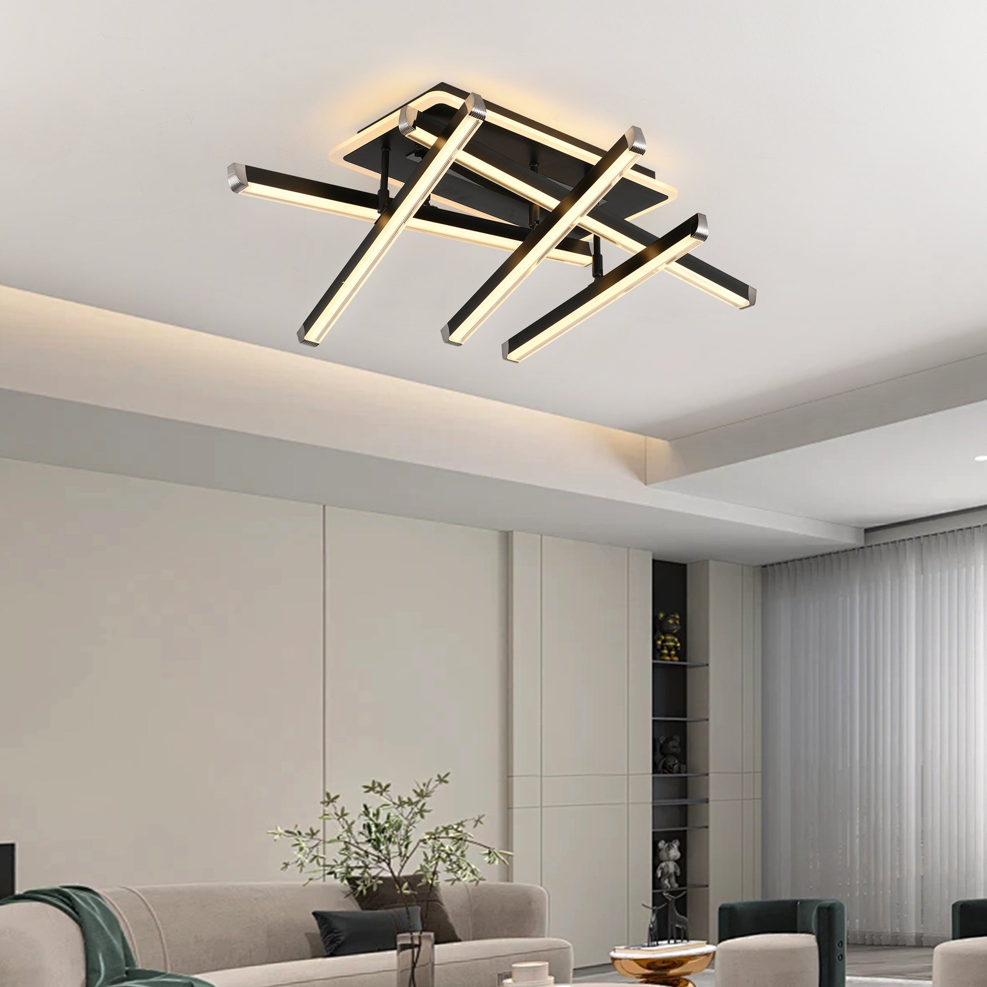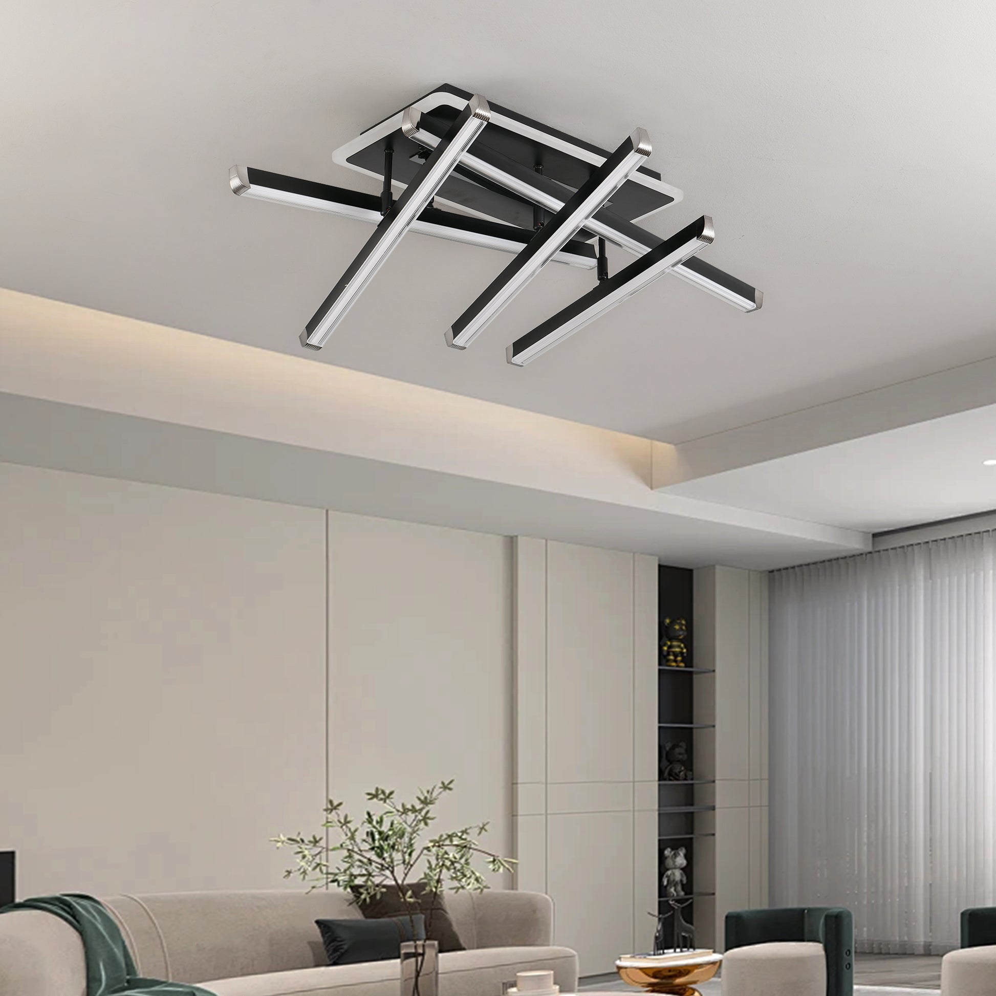 Lustra LED Evea cu latimea de 55 cm, inaltimea de 18 cm, iar lungimea de 80 cm confectionata din metal si acril negru, cu 6 surse de iluminat tip banda LED, cu o putere de 142 W si 4 tipuri de lumina.
