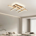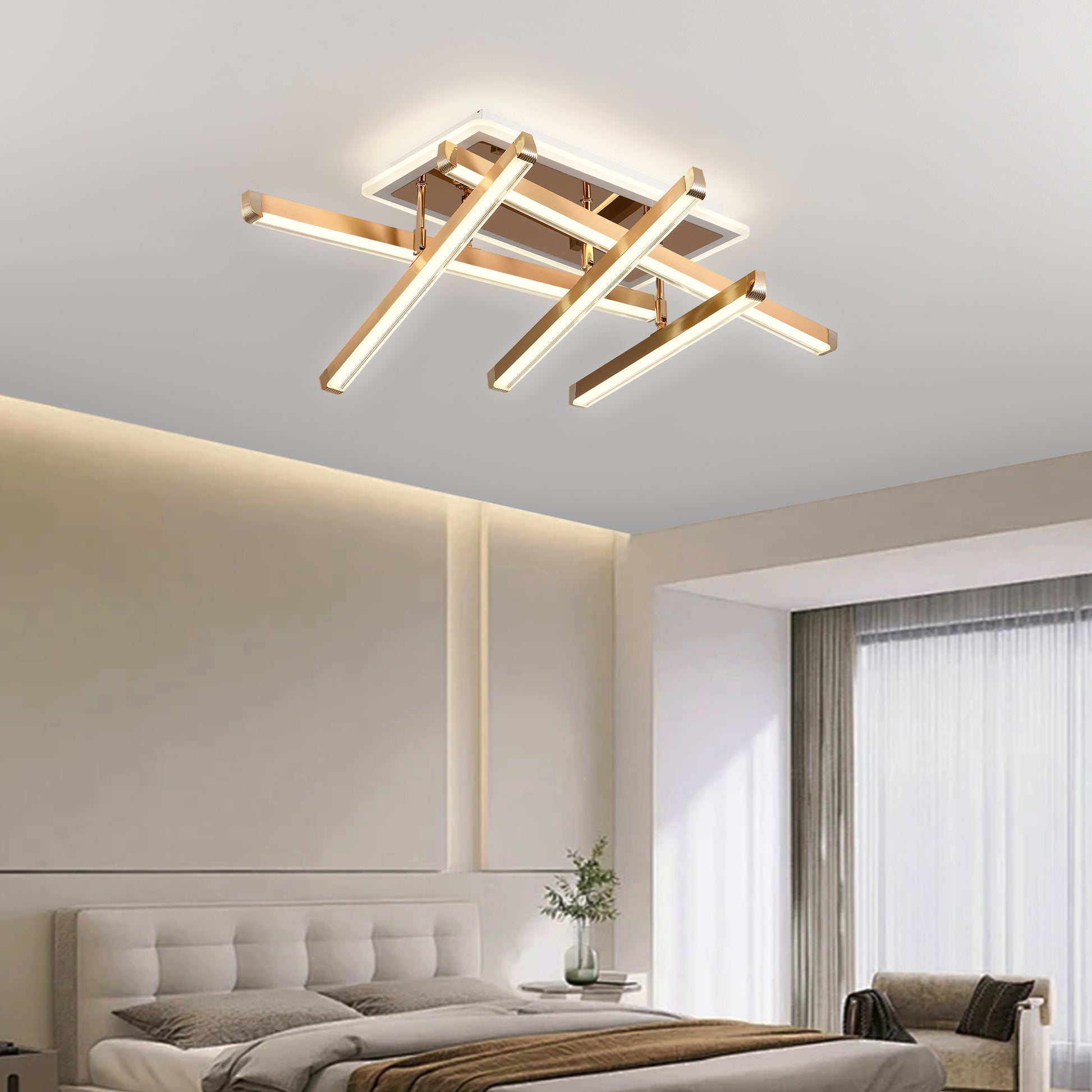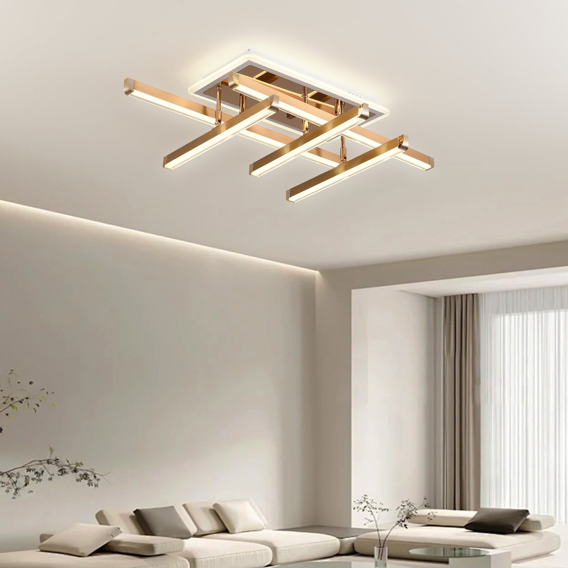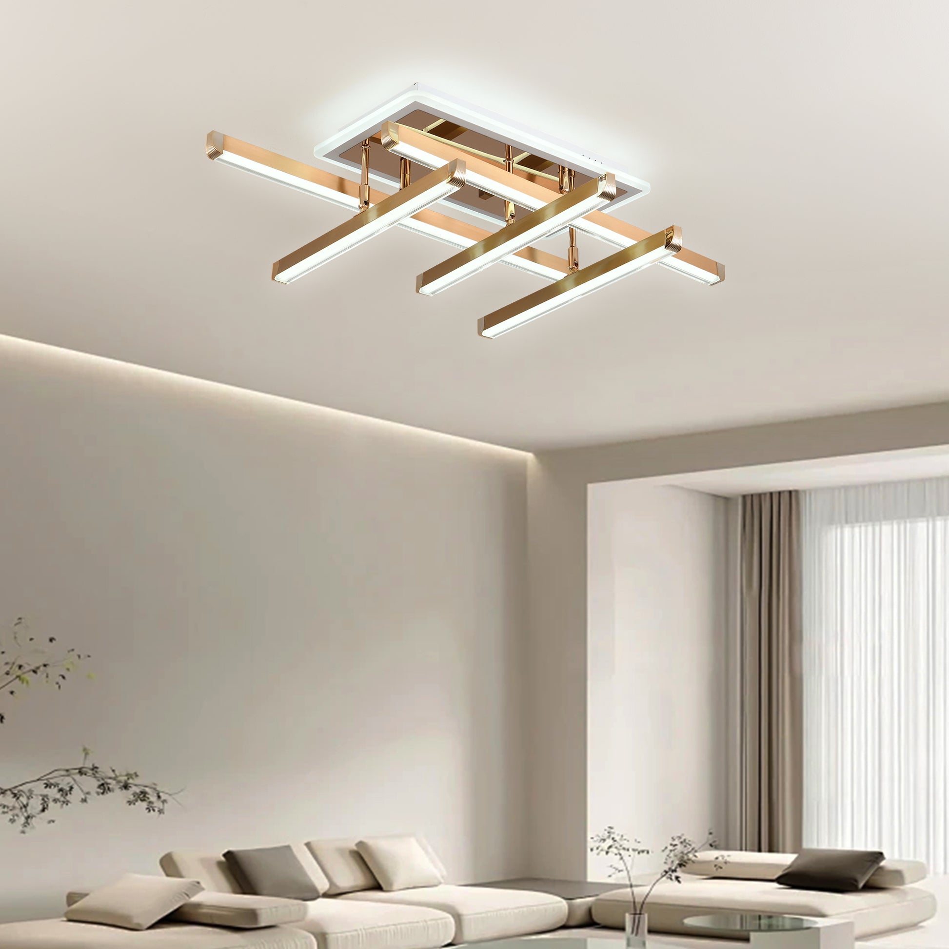 Lustra LED Evette cu latimea de 55 cm, inaltimea de 18 cm, iar lungimea de 80 cm confectionata din metal si acril auriu, cu 6 surse de iluminat tip banda LED, cu o putere de 142 W si 4 tipuri de lumina.