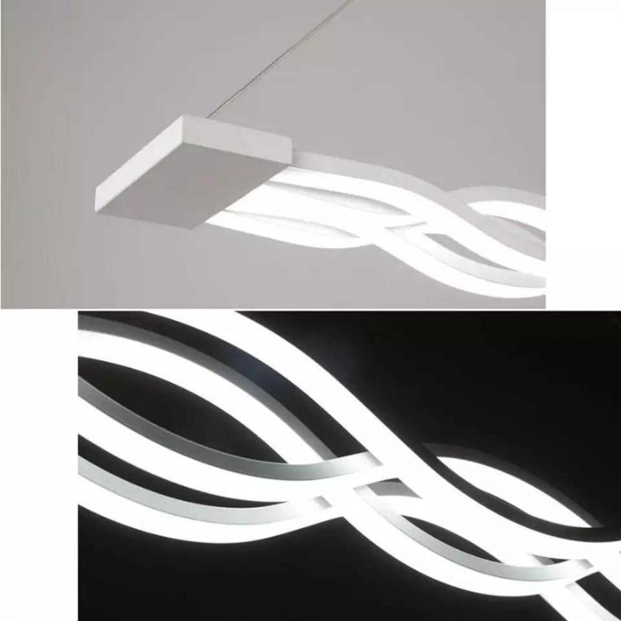 Lustra LED Infinite cu latimea de 12 cm, inaltimea de 80 cm, iar lungimea de 100 cm confectionata din acril alb, cu 4 surse de iluminat tip banda LED, cu o putere de 160 W si 4 tipuri de lumina.