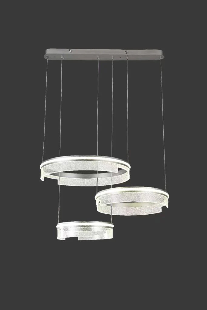 Lustra LED Joana cu diametrul cercului mic de 30 cm, diametrul cercului mediu 40, diametrul cercului mare de 50 cm, iar inaltimea reglabila de la 40 cm pana la 120 cm, confectionata din metal si acril alb si gri, cu 3 surse de iluminat tip banda LED, cu o putere de 360 W si 4 tipuri de lumina.
