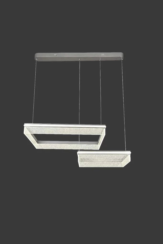 Lustra LED Jordyn cu diametrul dreptunghiului mic de 30 cm, diametrul dreptunghiului mare de 60 cm iar inaltimea reglabila de la 40 cm la 100 cm, confectionata din metal si acril alb si gri, cu 2 surse de iluminat tip banda LED, cu o putere de 100 W si 4 tipuri de lumina.