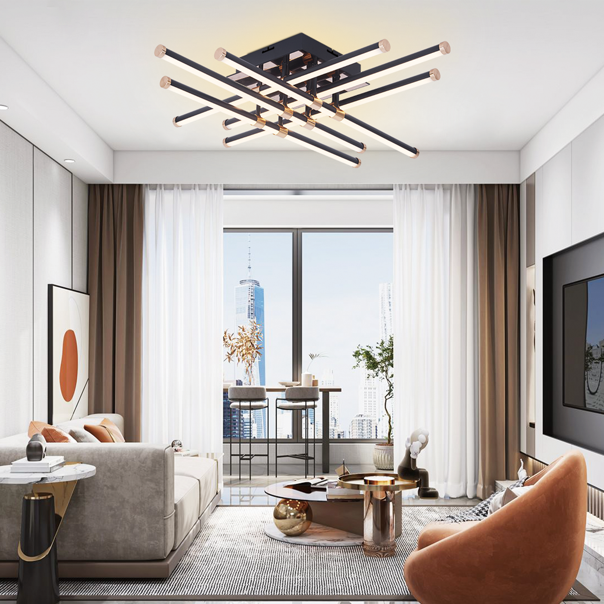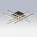 Lustra LED Kaida cu latimea de 70 cm, inaltimea de 15 cm, iar lungimea de 70 cm confectionata din acril si metal negru, auriu, cu 6 surse de iluminat tip banda LED, cu o putere de 144 W si 3 tipuri de lumina.