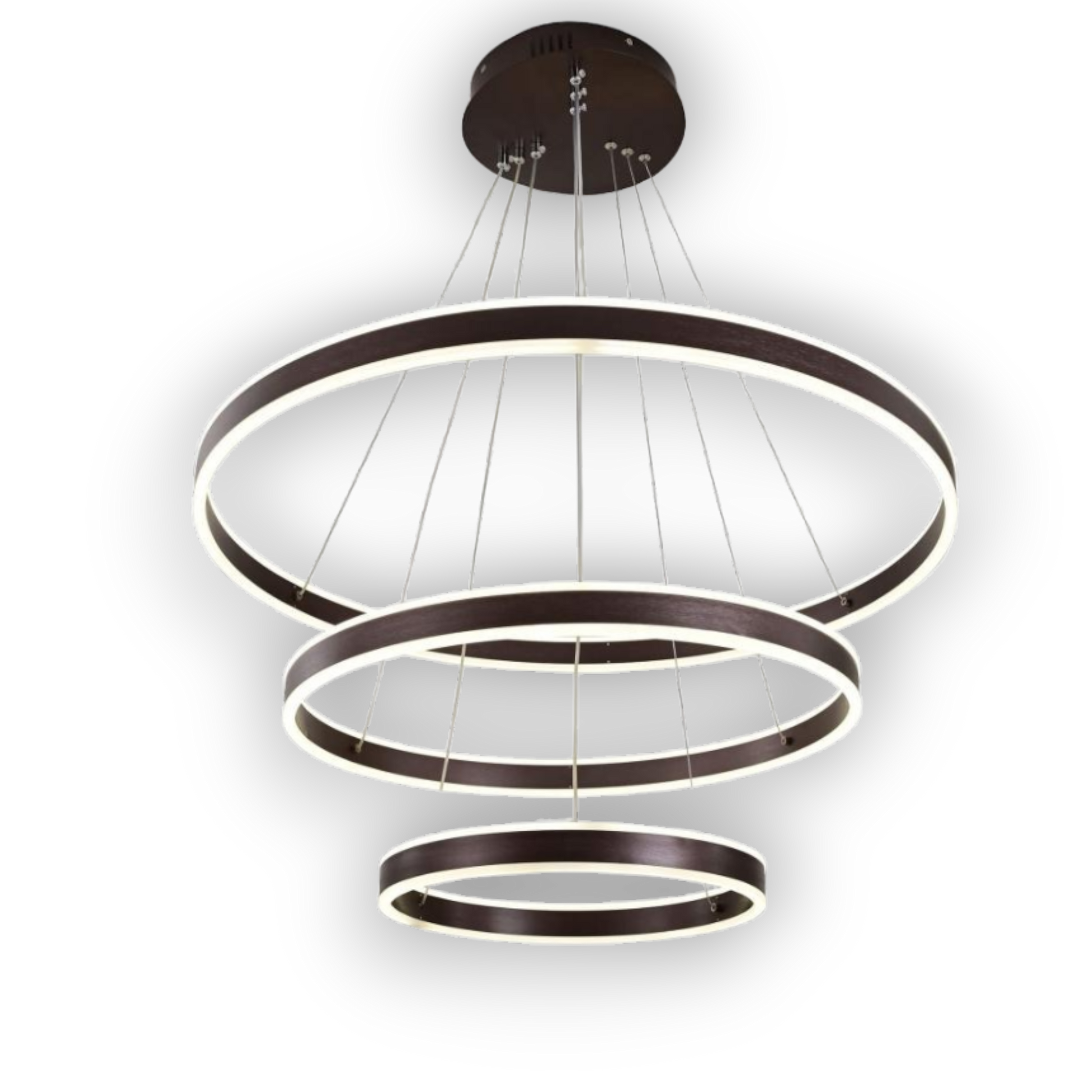 Lustra LED Luiza cu diametrul cercului mic de 40 cm, diametrul cercului mediu 60, diametrul cercului mare de 80 cm, iar inaltimea de 75 cm confectionata din metal si acril alb si maro, cu 2 surse de iluminat tip banda LED, cu o putere de 400 W si 4 tipuri de lumina.