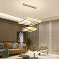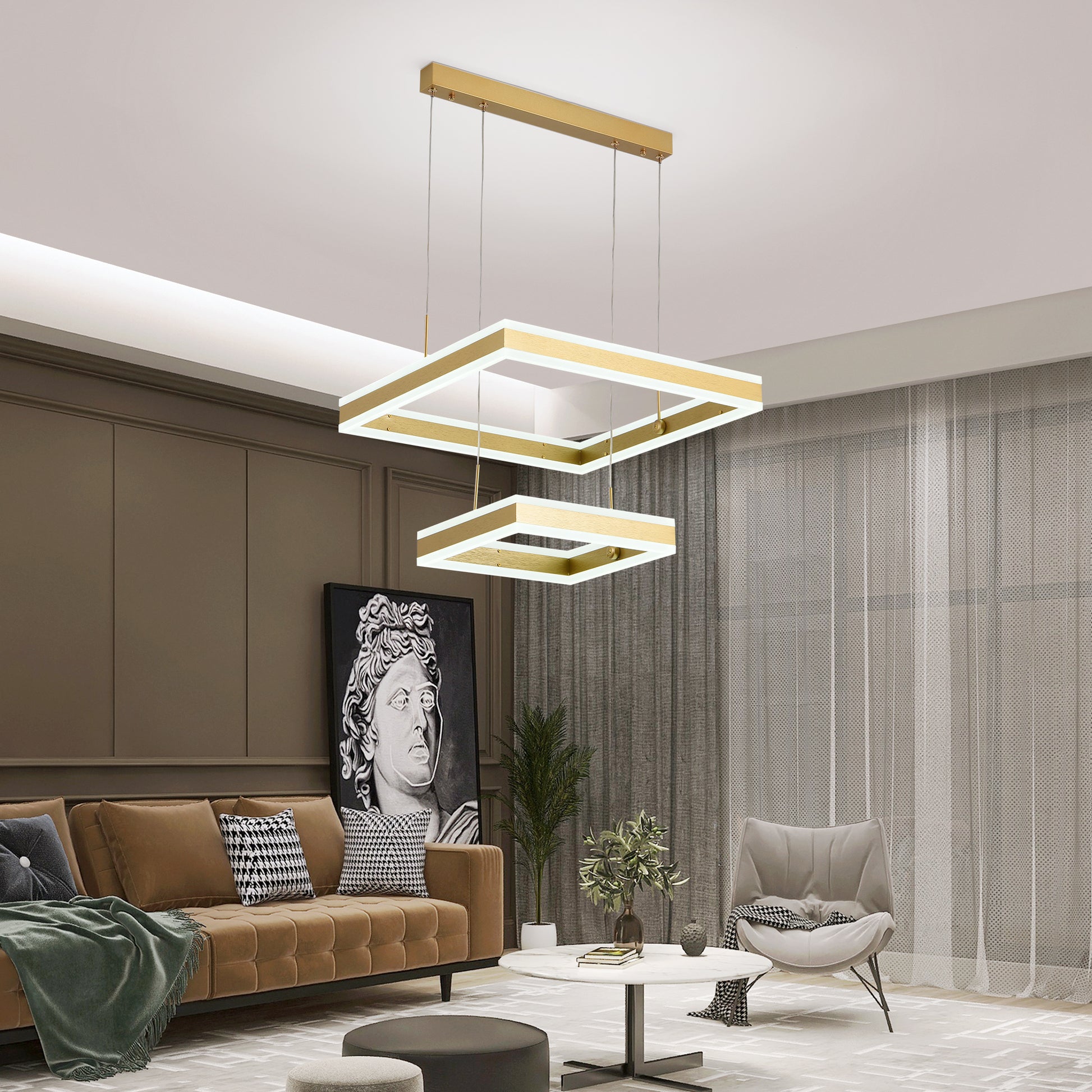 Lustra LED Jydia dimensiunile patratului mare de 50x50 cm, dimensiunile patratului mic de 30x30, iar inaltimea reglabila de min 40 cm max 100 cm, confectionata din acril si metal, cu 2 surse de iluminat tip banda LED, cu o putere de 256 W si 3 tipuri de lumina.