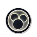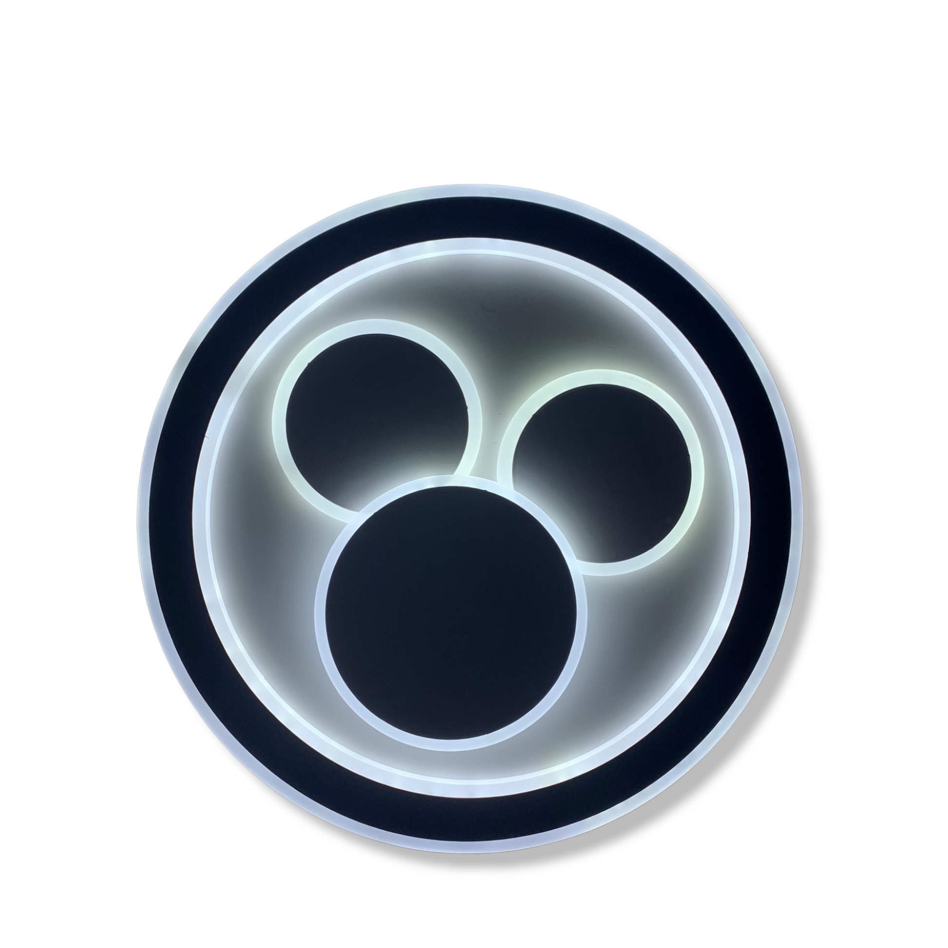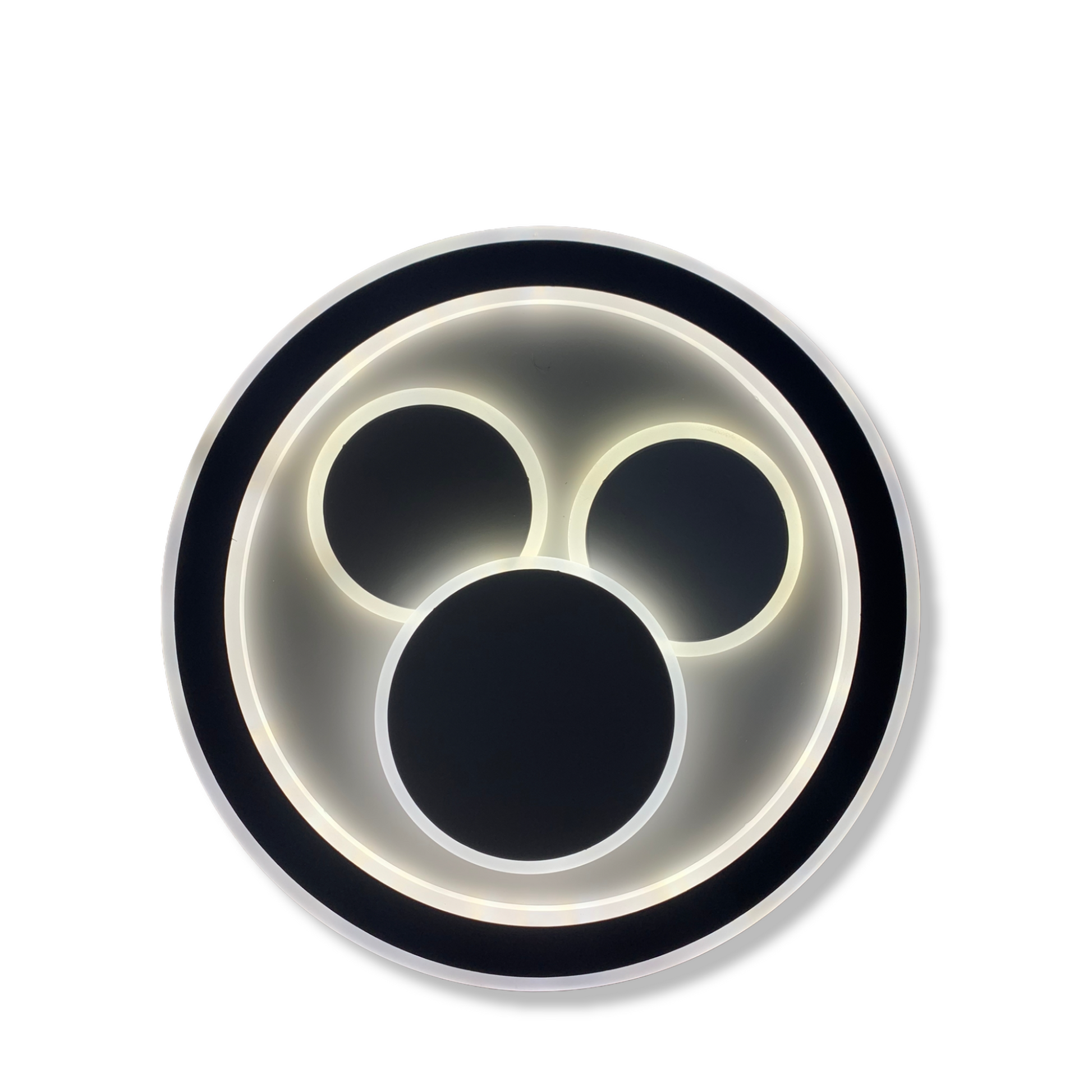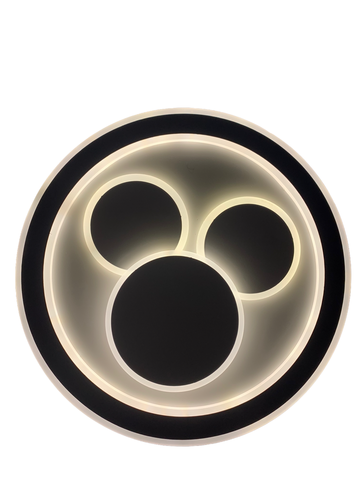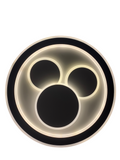 Lustra LED de forma rotunda model Mickey, cu diametru de 48 cm confectionata din acril alb si negru, cu 5 surse de iluminat tip banda LED, cu o putere de 140 W si 4 tipuri de lumina.