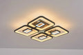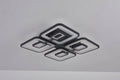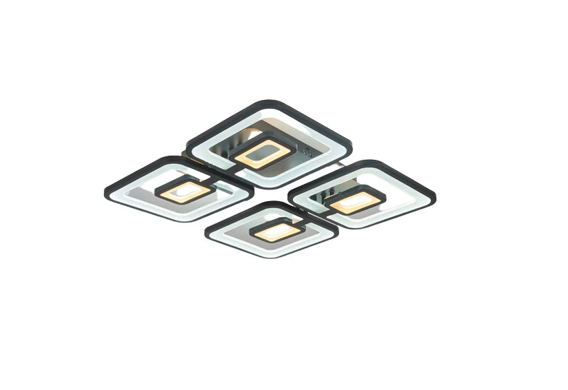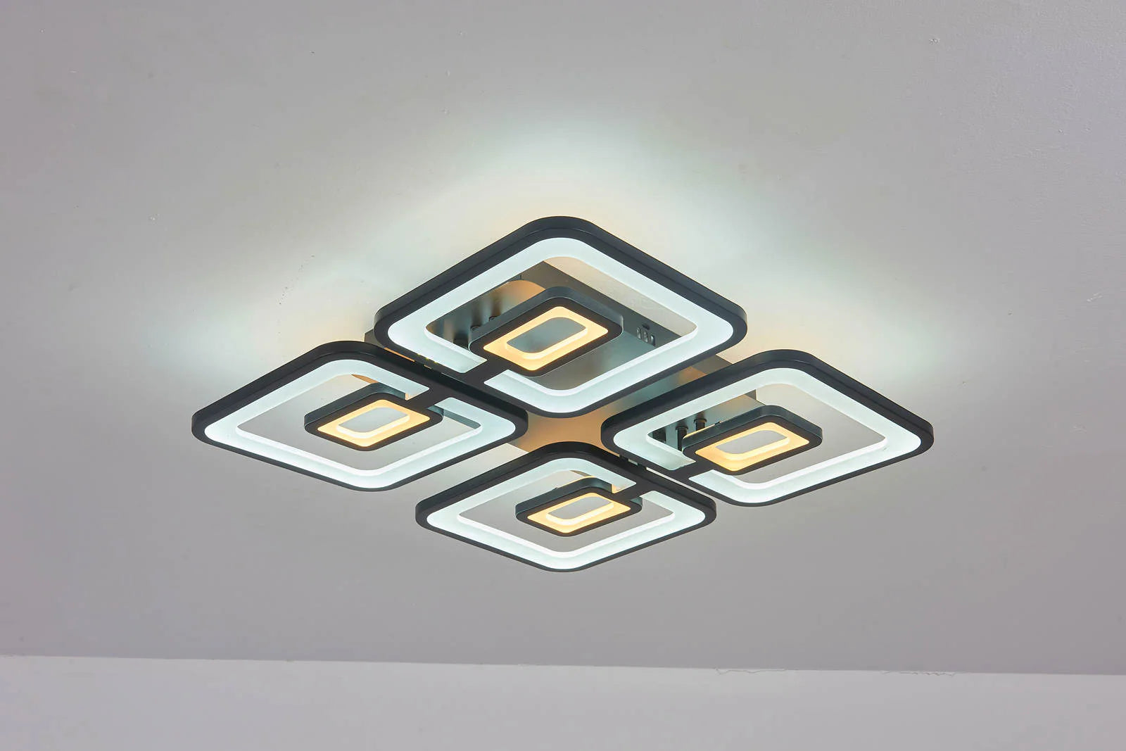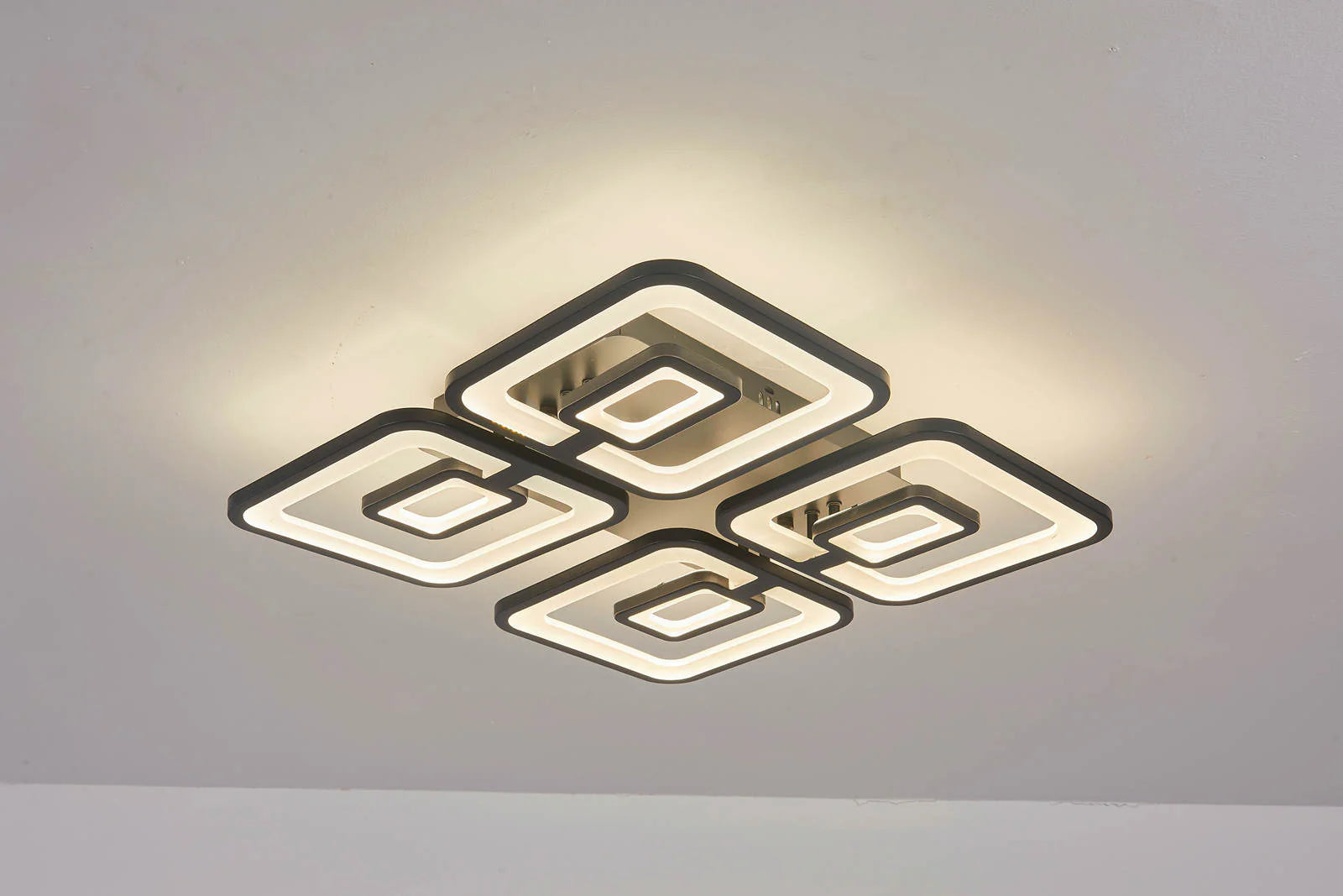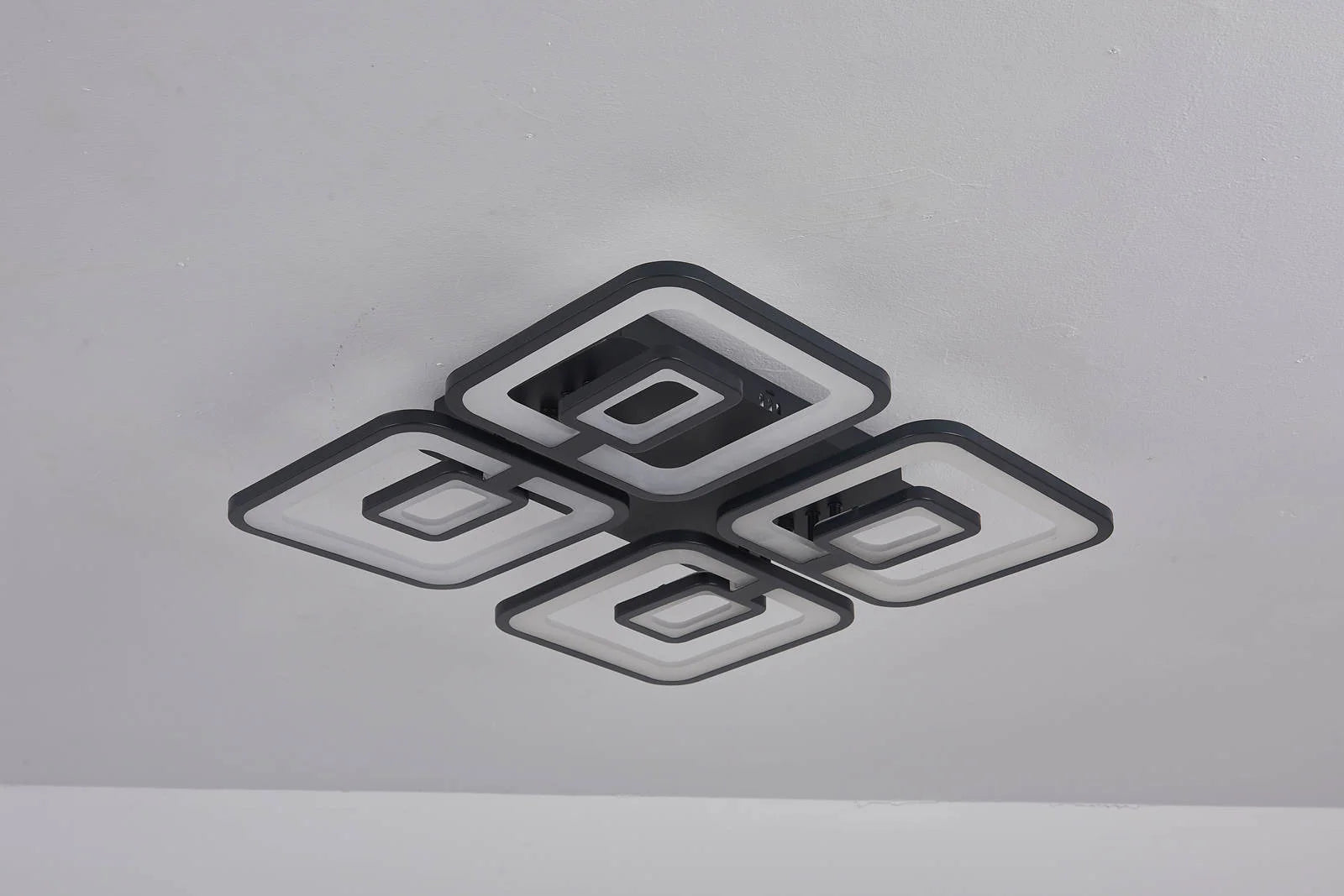 Lustra LED Rebeca cu latimea de 53 cm, inaltimea de 10 cm, iar lungimea de 53 cm confectionata din metal si acril negru, cu 4 surse de iluminat tip banda LED, cu o putere de 200 W si 4 tipuri de lumina.