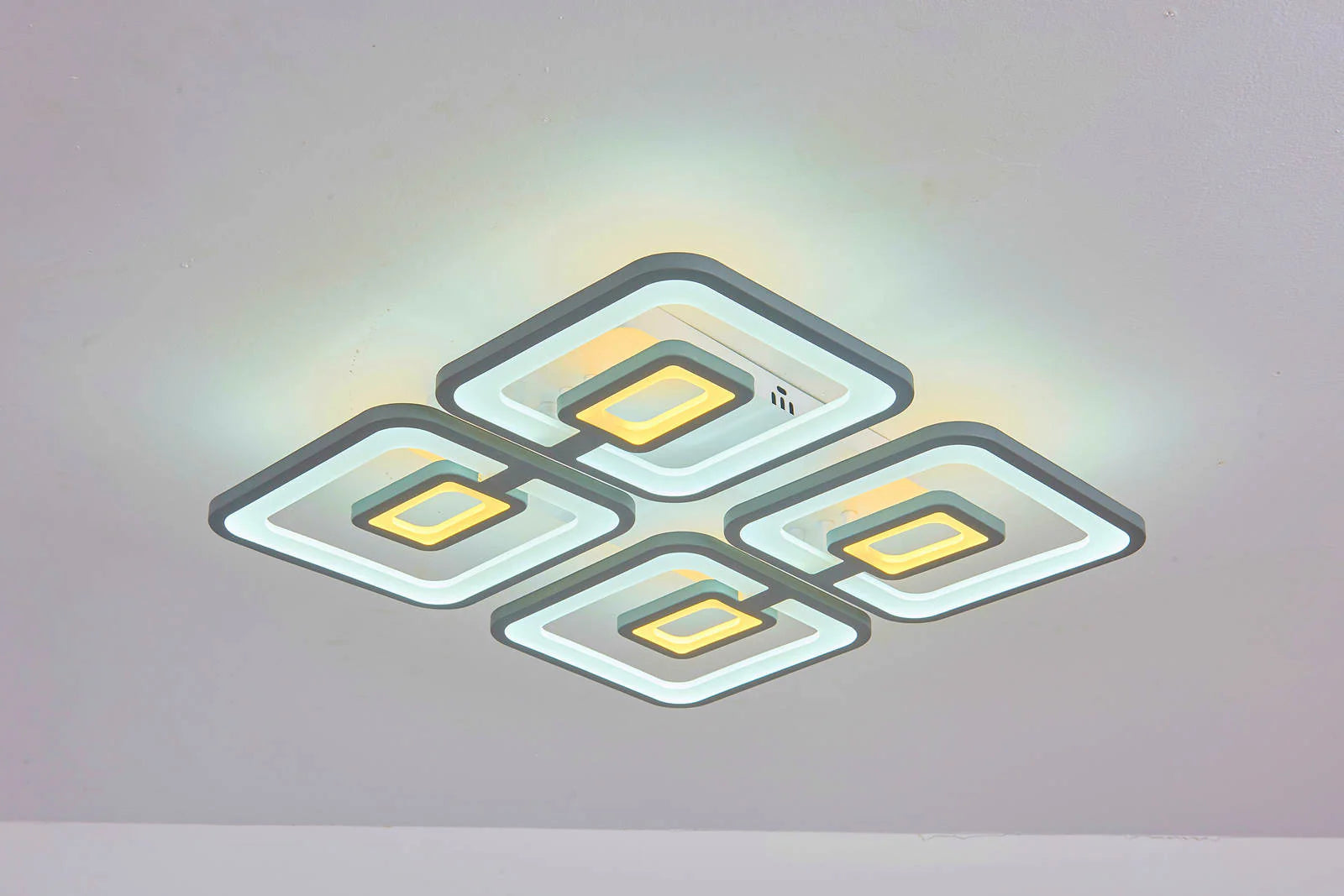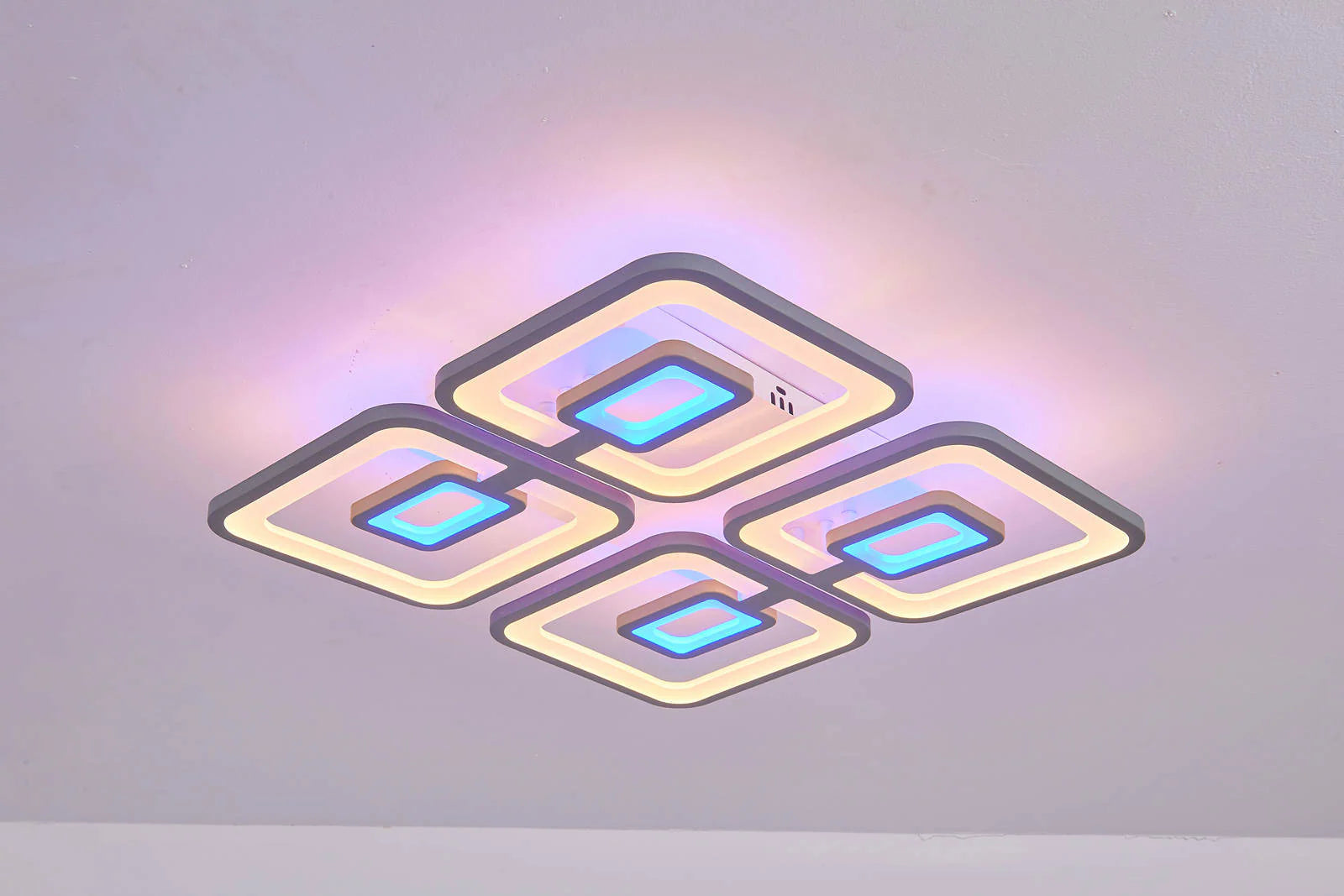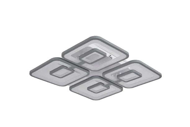 Lustra LED Reka cu latimea de 53 cm, inaltimea de 10 cm, iar lungimea de 53 cm confectionata din metal acril si alb, cu 4 surse de iluminat tip banda LED, cu o putere de 200 W si 4 tipuri de lumina.