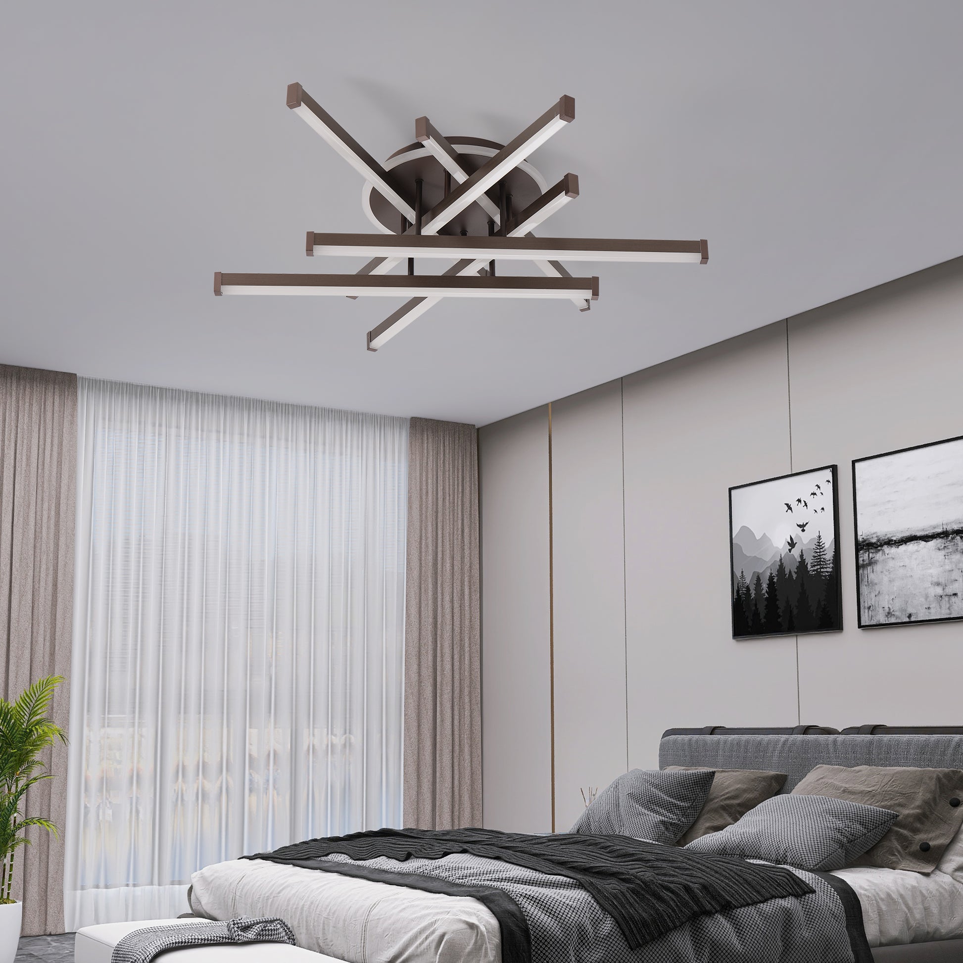 Lustra LED Sabina cu latimea de 65 cm, inaltimea de 13 cm, iar lungimea de 65 cm confectionata din metal si acril maro, cu 6 surse de iluminat tip banda LED, cu o putere de 150 W si 4 tipuri de lumina.