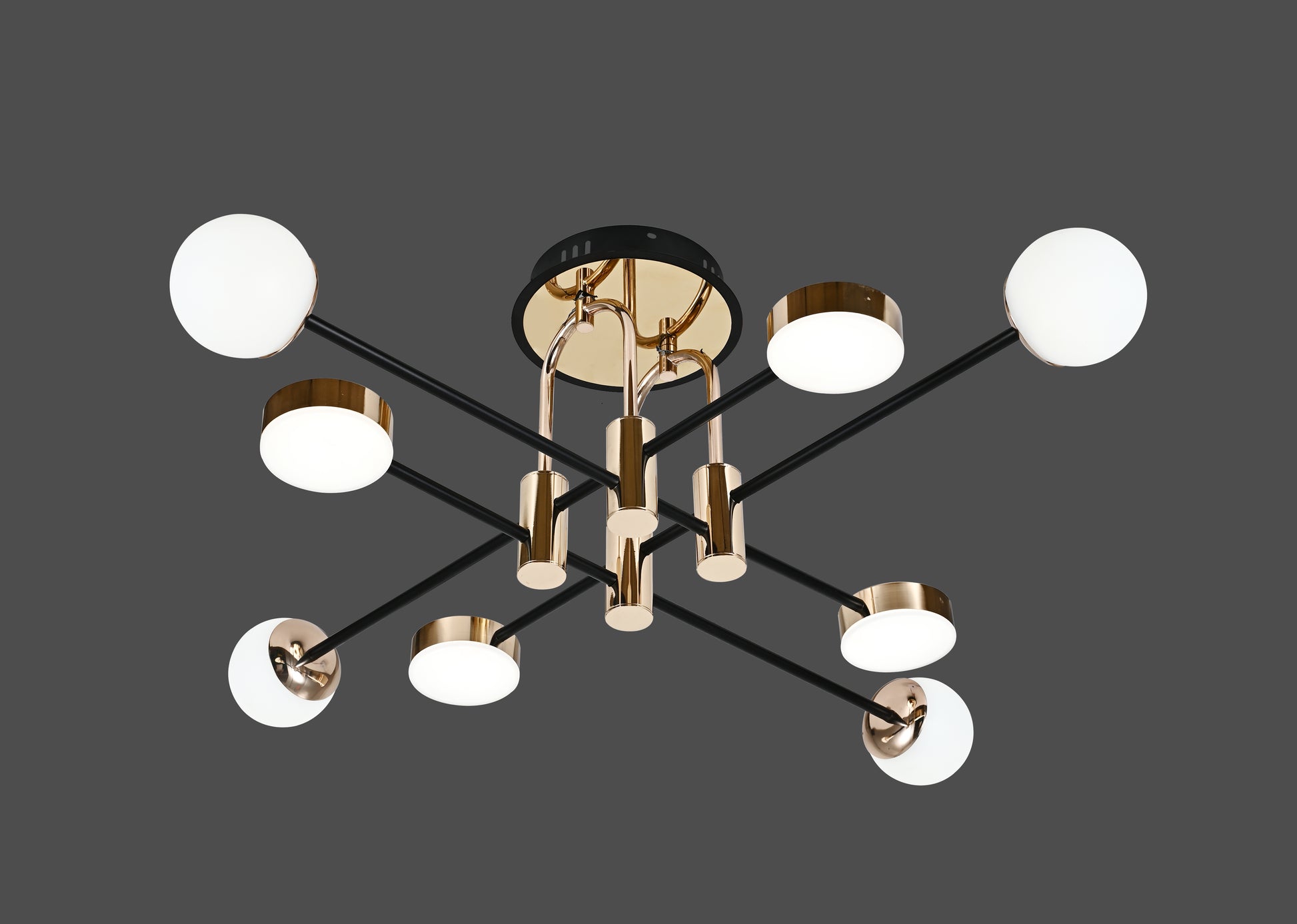 Lustra LED Tinca cu latimea de 94 cm, inaltimea de 28 cm, iar lungimea de 94 cm confectionata din metal auriu,negru si acril alb, cu 8 surse de iluminat tip banda LED, cu o putere de 100 W si 3 tipuri de lumina.