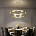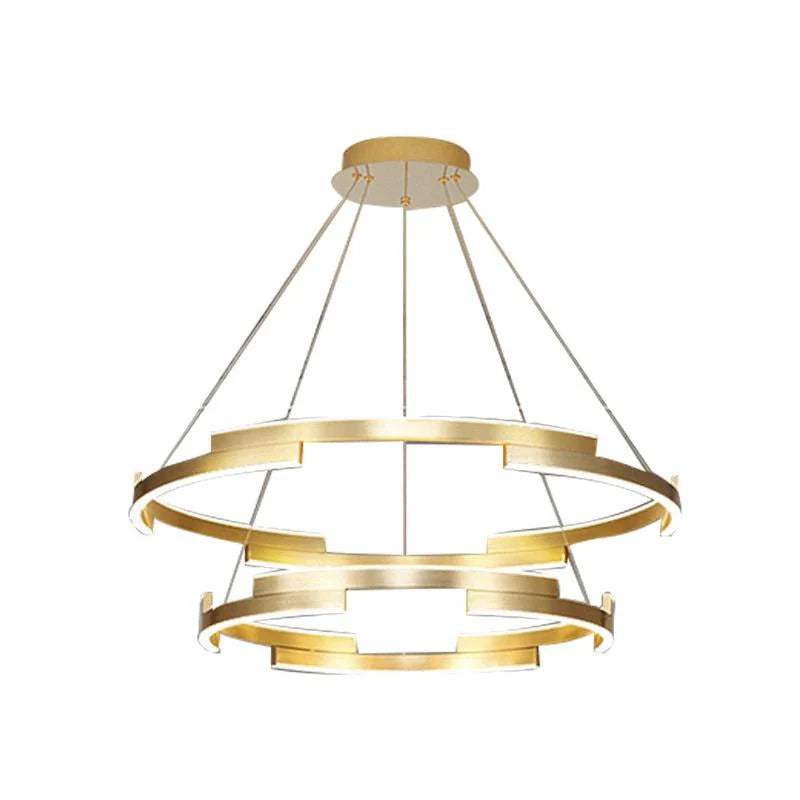 Lustra LED Tonia cu diametrul cercului mare de 60 cm, diametrul cercului mic de 40 cm, iar inaltimea de la 40 cm la 120 cm, confectionata din acril si metal auriu, cu 2 surse de iluminat tip banda LED, cu o putere de 85 W si 3 tipuri de lumina.