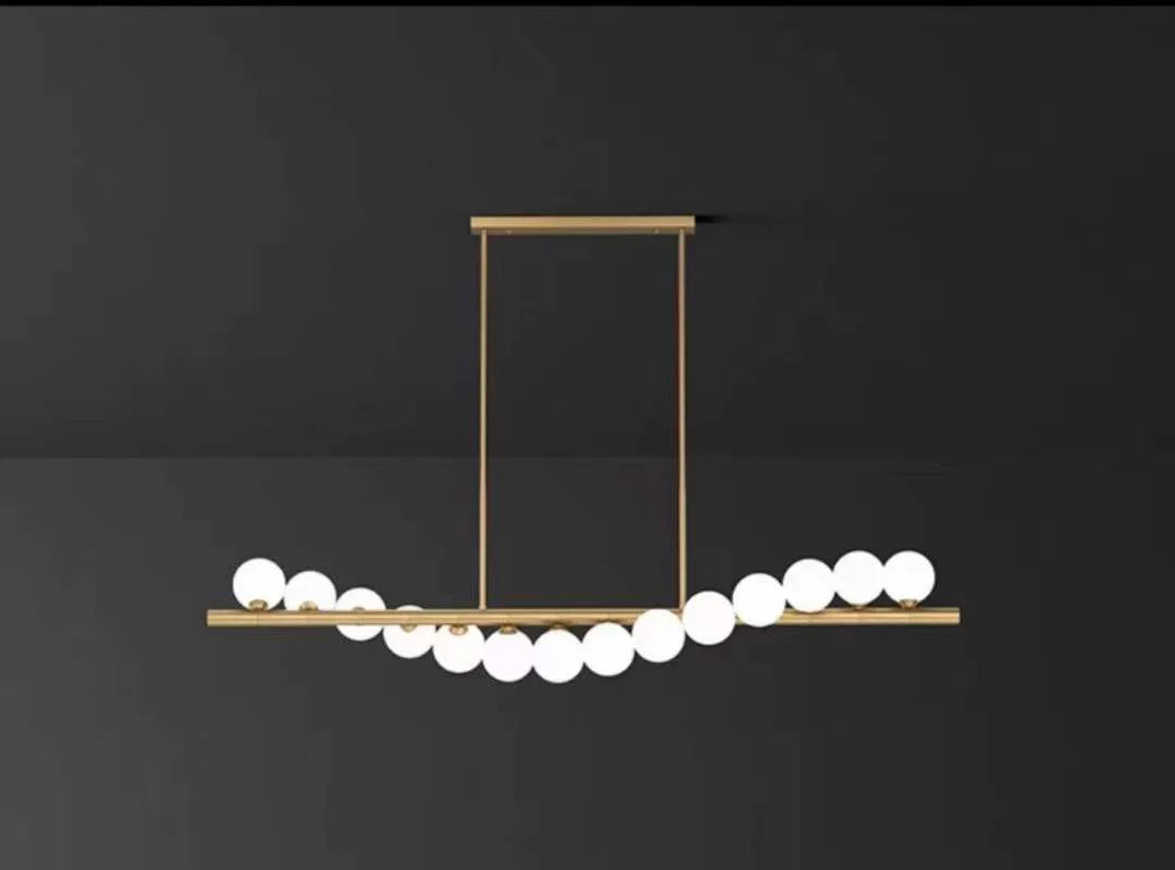 Lustra Nicola cu lungimea de 145 cm, latimea de 30 cm, iar inaltimea de la 40 cm pana la 100 cm, confectionata din sticla si metal, cu 14 surse de iluminat tip bec G9.